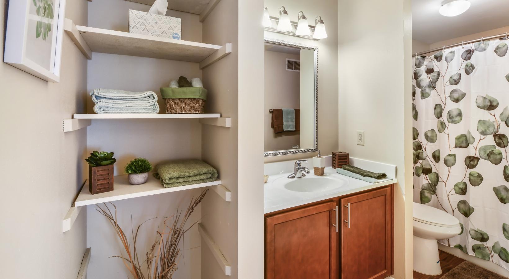• a bathroom with a sink and shelves