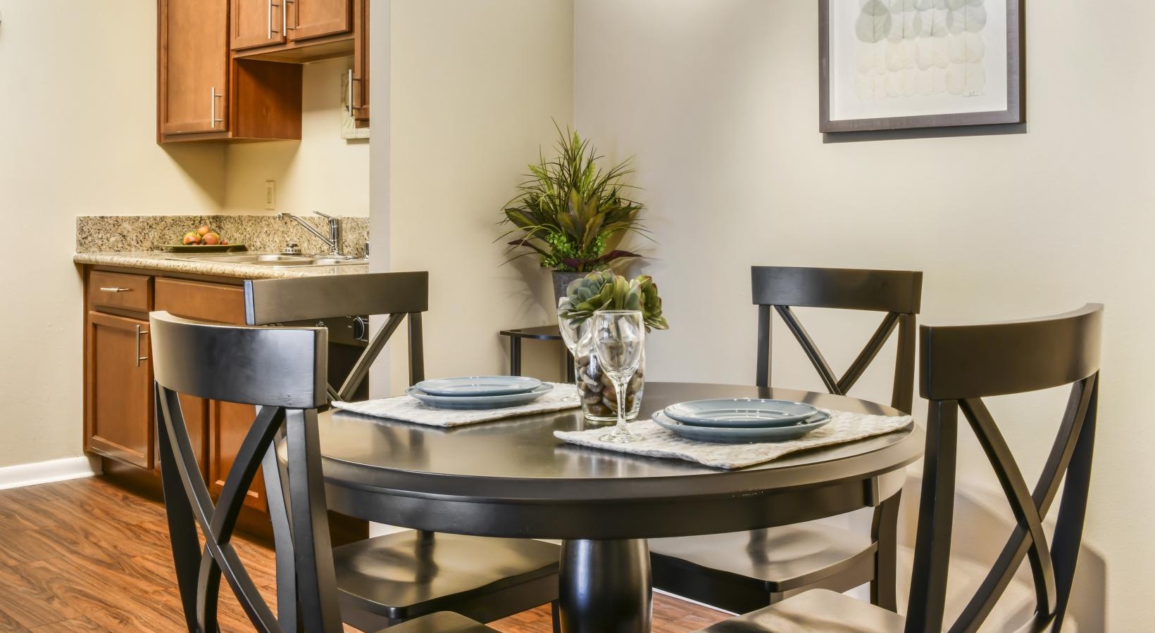 • a kitchen with a table and chairs