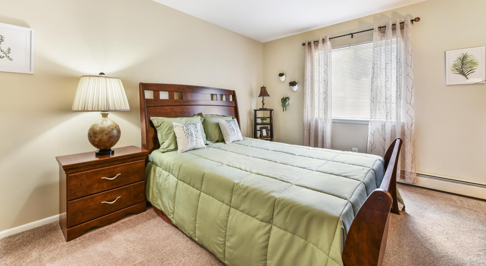 • a bedroom with a bed and a bench