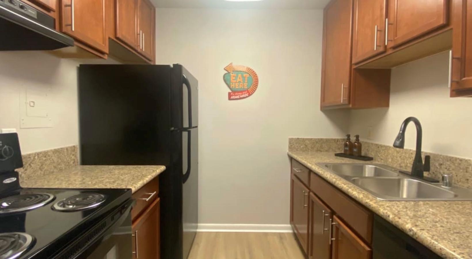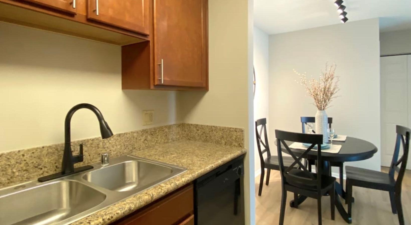 • a kitchen with wooden cabinets